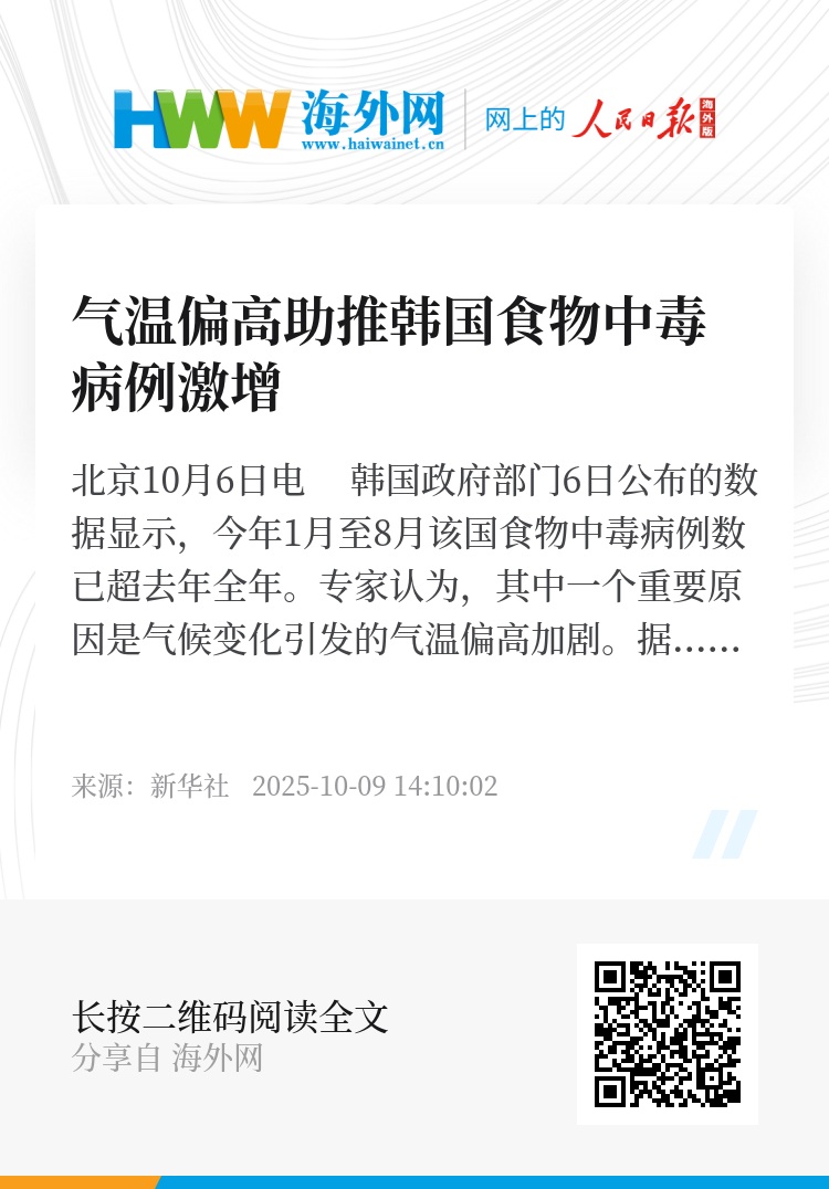 新华社北京10月6日电 韩国政府部门6日公布的数据显示,今年1月至8月该国食物中毒病例数已超去年全年。专家认为,其中一个重要原因是气候变化引发的气温偏高加剧。
