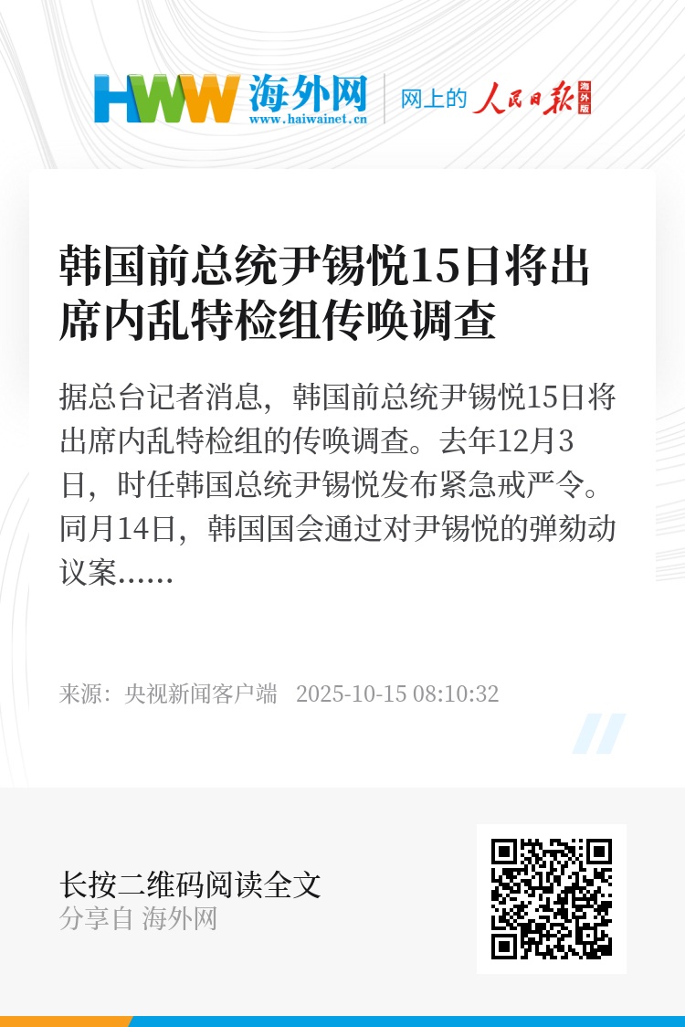 据总台记者消息,韩国前总统尹锡悦15日将出席内乱特检组的传唤调查。