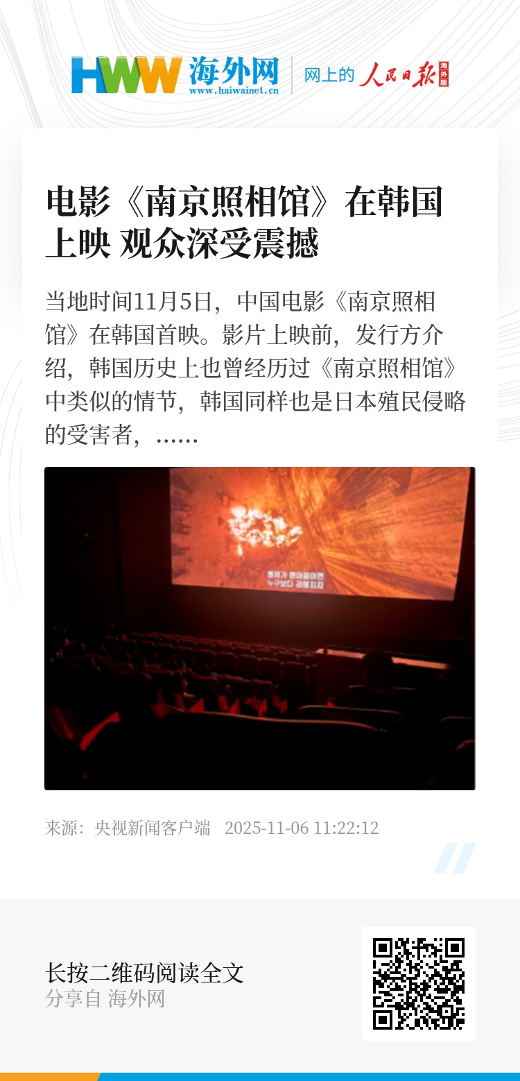 当地时间11月5日,中国电影《南京照相馆》在韩国首映。影片上映前,发行方介绍,韩国历史上也曾经历过《南京照相馆》中类似的情节,韩国同样也是日本殖民侵略的受害者,韩国观众一定会对影片深受触动、获得共鸣。