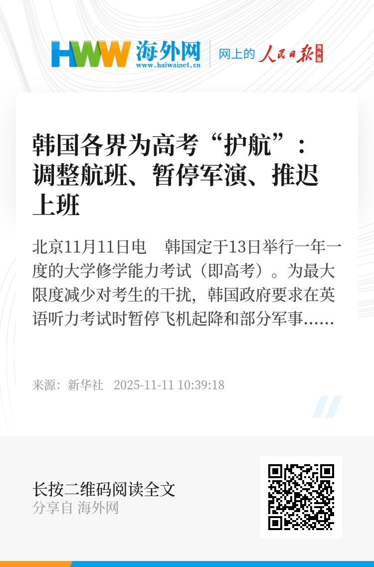新华社北京11月11日电 韩国定于13日举行一年一度的大学修学能力考试(即高考)。为最大限度减少对考生的干扰,韩国政府要求在英语听力考试时暂停飞机起降和部分军事演习,同时推迟上班时间为考生“让路”。