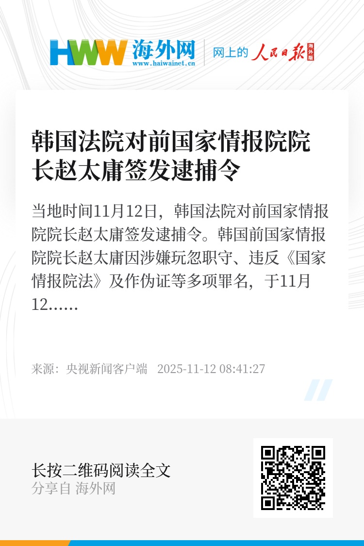 韩国前国家情报院院长赵太庸因涉嫌玩忽职守、违反《国家情报院法》及作伪证等多项罪名,于11月12日被首尔中央地方法院批捕。法院指出,赵太庸“有毁灭证据的可能”,同意检方申请逮捕。