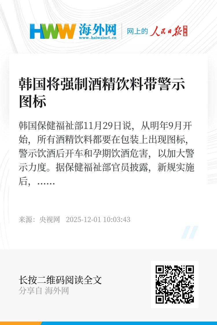 韩国保健福祉部11月29日说,从明年9月开始,所有酒精饮料都要在包装上出现图标,警示饮酒后开车和孕期饮酒危害,以加大警示力度。