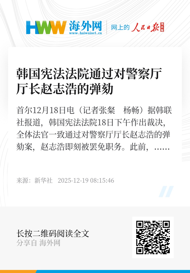 新华社首尔12月18日电(记者张粲 杨畅)据韩联社报道,韩国宪法法院18日下午作出裁决,全体法官一致通过对警察厅厅长赵志浩的弹劾案,赵志浩即刻被罢免职务。此前,赵志浩已停职371天。