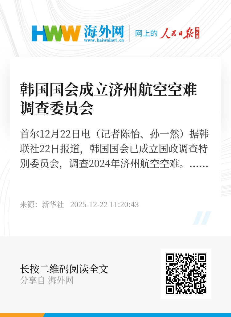 新华社首尔12月22日电(记者陈怡、孙一然)据韩联社22日报道,韩国国会已成立国政调查特别委员会,调查2024年济州航空空难。