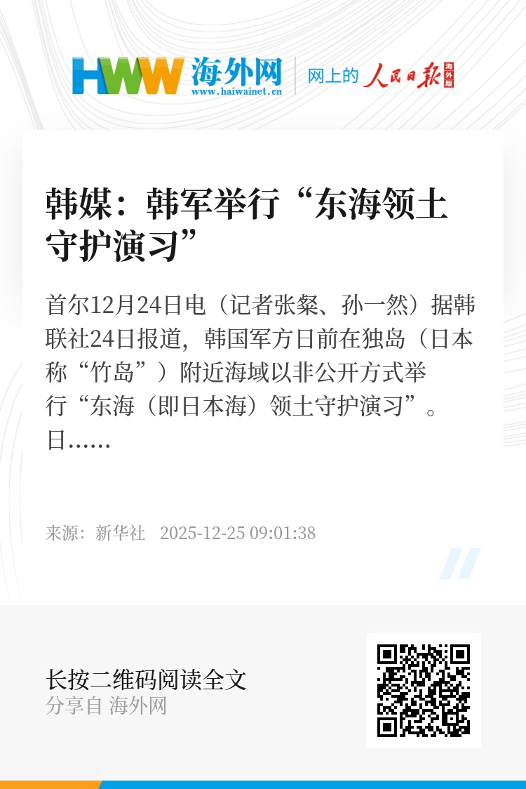 新华社首尔12月24日电(记者张粲、孙一然)据韩联社24日报道,韩国军方日前在独岛(日本称“竹岛”)附近海域以非公开方式举行“东海(即日本海)领土守护演习”。日本方面对此提出抗议。