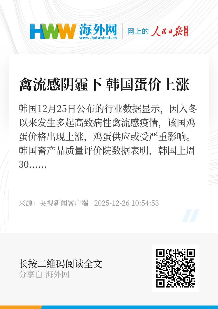 韩国12月25日公布的行业数据显示,因入冬以来发生多起高致病性禽流感疫情,该国鸡蛋价格出现上涨,鸡蛋供应或受严重影响。
