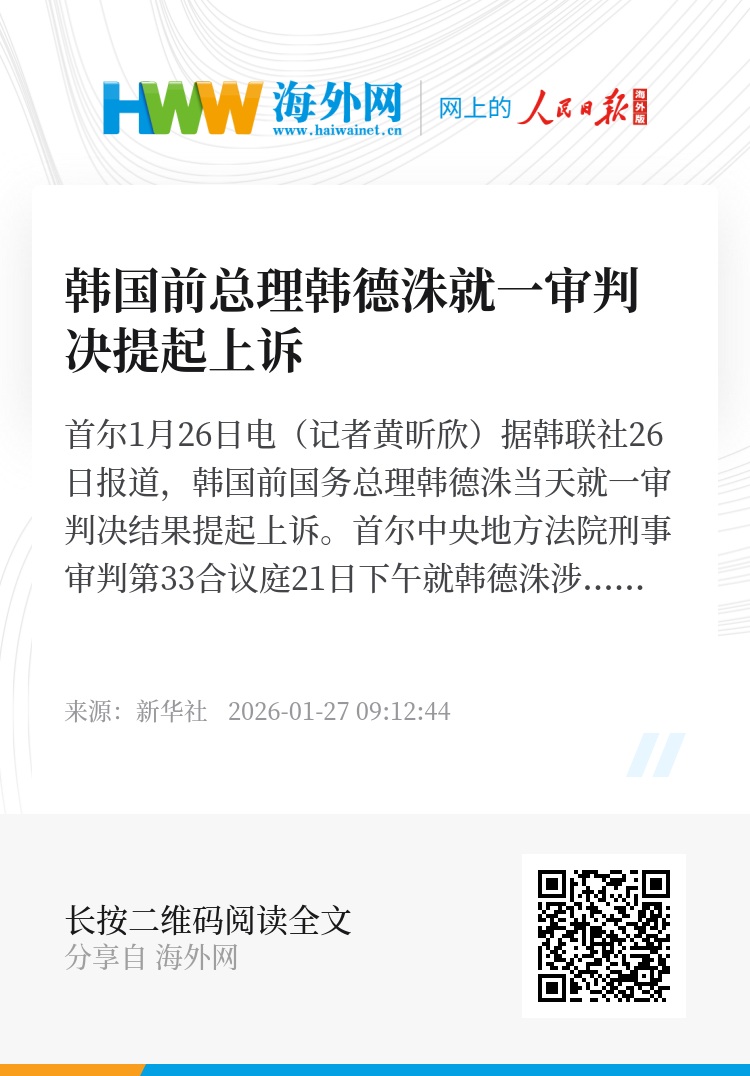 新华社首尔1月26日电(记者黄昕欣)据韩联社26日报道,韩国前国务总理韩德洙当天就一审判决结果提起上诉。
