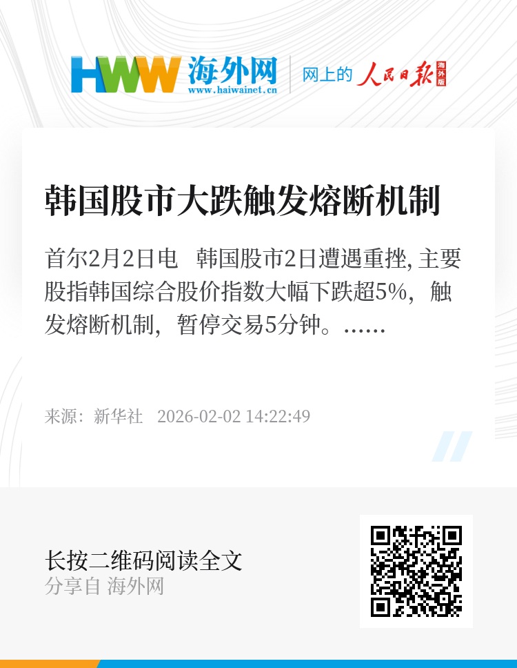 新华社首尔2月2日电 韩国股市2日遭遇重挫,主要股指韩国综合股价指数大幅下跌超5%,触发熔断机制,暂停交易5分钟。