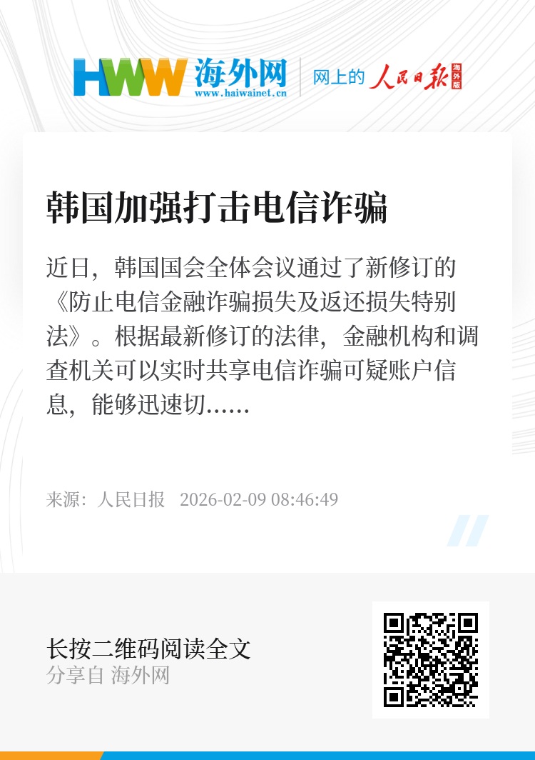 近日,韩国国会全体会议通过了新修订的《防止电信金融诈骗损失及返还损失特别法》。根据最新修订的法律,金融机构和调查机关可以实时共享电信诈骗可疑账户信息,能够迅速切断账户转账,以预防犯罪手法日益升级的电信诈骗。