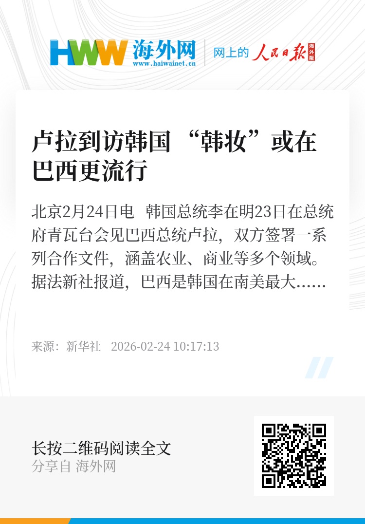 新华社北京2月24日电 韩国总统李在明23日在总统府青瓦台会见巴西总统卢拉,双方签署一系列合作文件,涵盖农业、商业等多个领域。