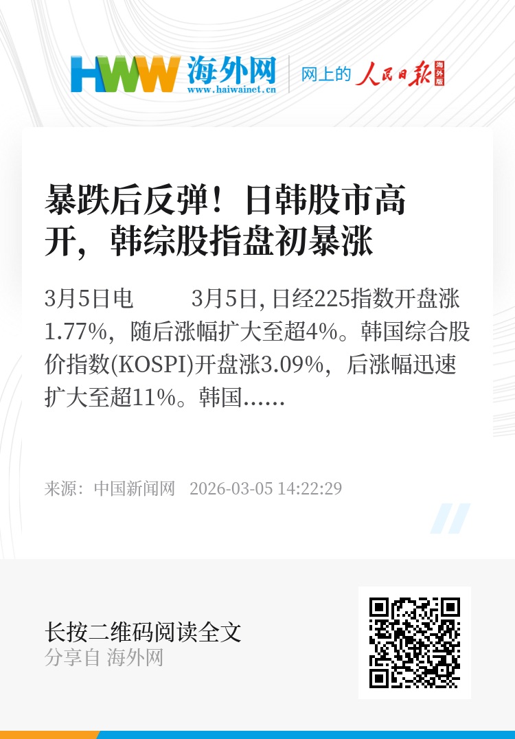 中新网3月5日电 3月5日,日经225指数开盘涨1.77%,随后涨幅扩大至超4%。韩国综合股价指数(KOSPI)开盘涨3.09%,后涨幅迅速扩大至超11%。
