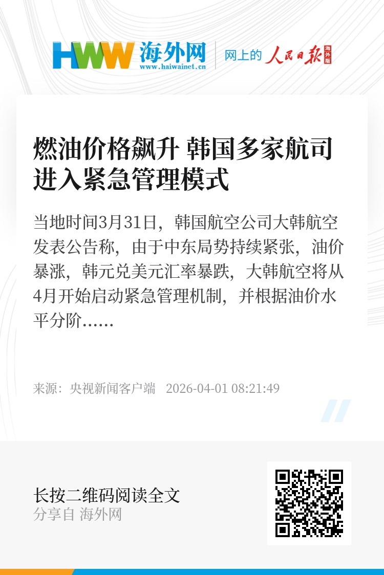 当地时间3月31日,韩国航空公司大韩航空发表公告称,由于中东局势持续紧张,油价暴涨,韩元兑美元汇率暴跌,大韩航空将从4月开始启动紧急管理机制,并根据油价水平分阶段实施应对措施,以确保公司整体成本效益。