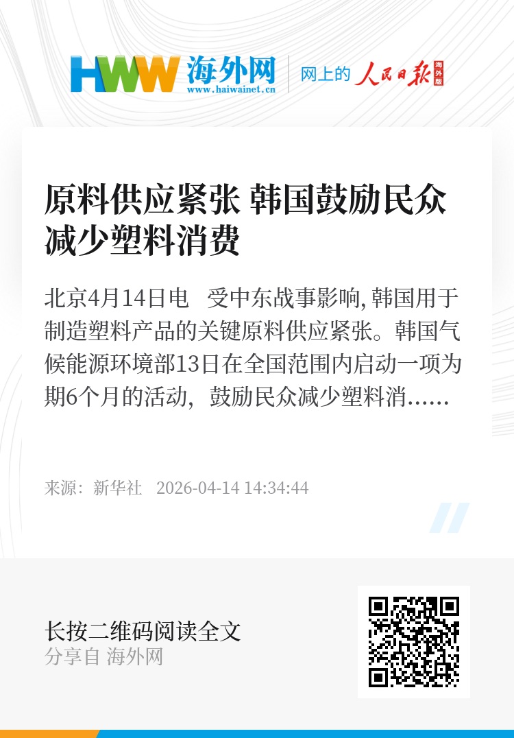 新华社北京4月14日电 受中东战事影响,韩国用于制造塑料产品的关键原料供应紧张。韩国气候能源环境部13日在全国范围内启动一项为期6个月的活动,鼓励民众减少塑料消费。
