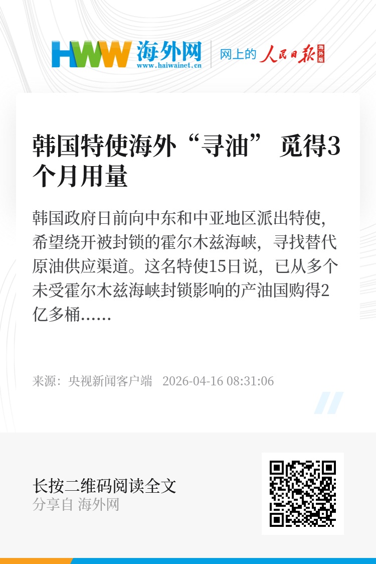 韩国政府日前向中东和中亚地区派出特使,希望绕开被封锁的霍尔木兹海峡,寻找替代原油供应渠道。这名特使15日说,已从多个未受霍尔木兹海峡封锁影响的产油国购得2亿多桶原油,可供韩国用3个月。