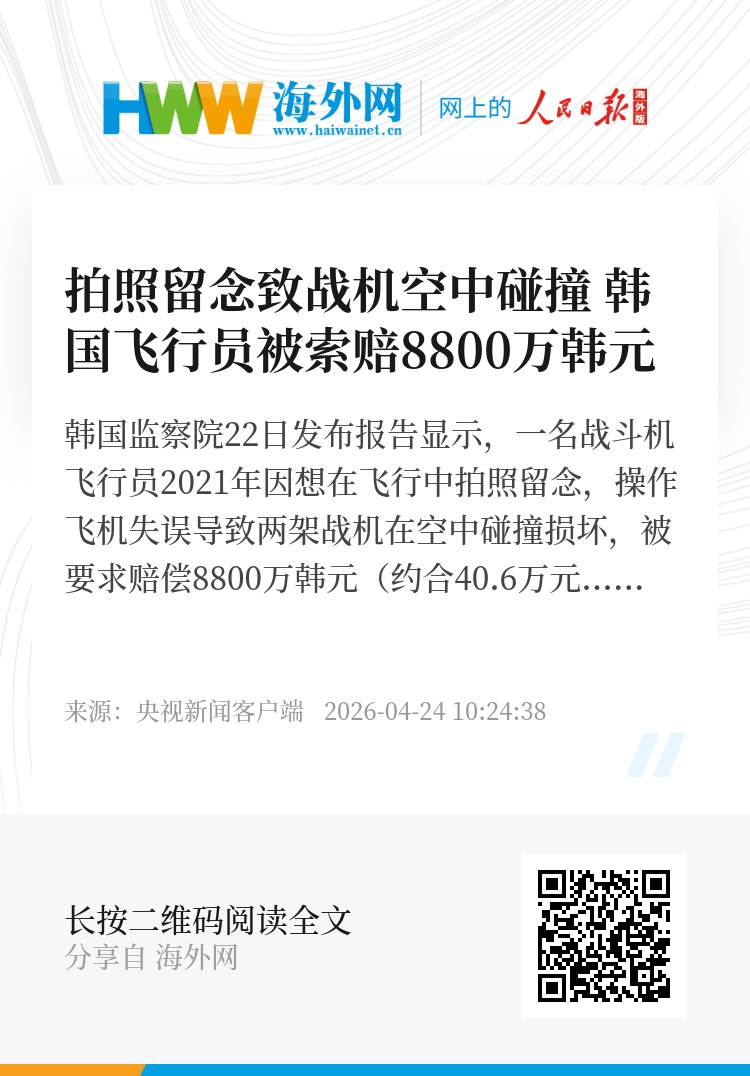 韩国监察院22日发布报告显示,一名战斗机飞行员2021年因想在飞行中拍照留念,操作飞机失误导致两架战机在空中碰撞损坏,被要求赔偿8800万韩元(约合40.6万元人民币)。