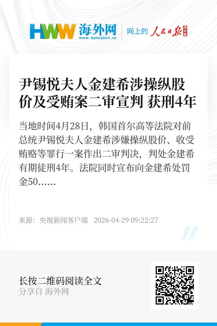 在此前进行的一审中,检方对金建希的多项指控被法院宣判无罪,金建希获有期徒刑1年8个月。在4月28日的宣判中,二审法院推翻部分一审无罪判决,金建希量刑增加至4年。